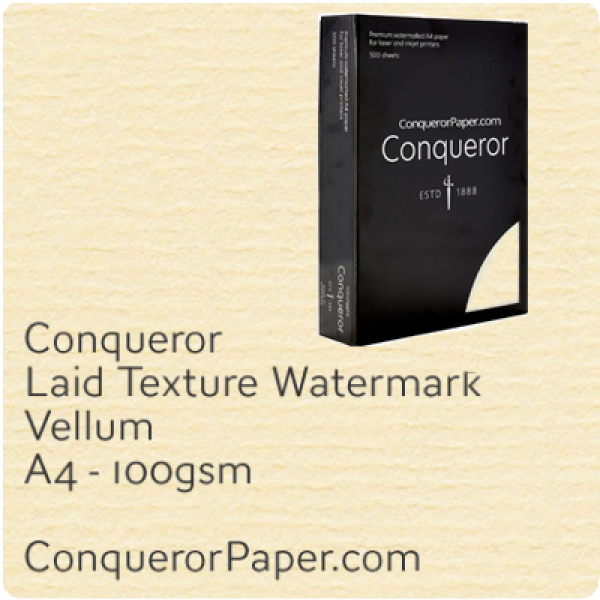 Tags: Conqueror Laid, TINT:Vellum, FINISH:Laid, PAPER:100gsm, SIZE:A4 - 210x297mm, QUANTITY:500Sheets, WATERMARK:Yes