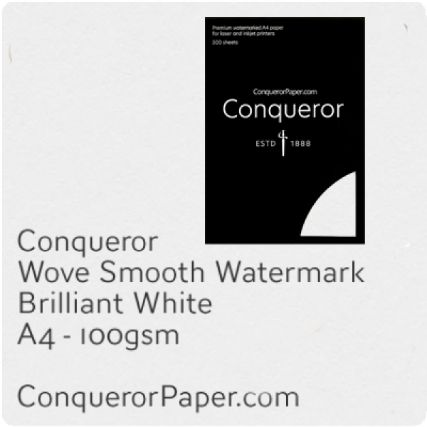 Tags: Conqueror Wove, TINT:BrilliantWhite, FINISH:Wove, PAPER:100gsm, SIZE:A4 210x297mm, QUANTITY:500Sheets, WATERMARK:Yes