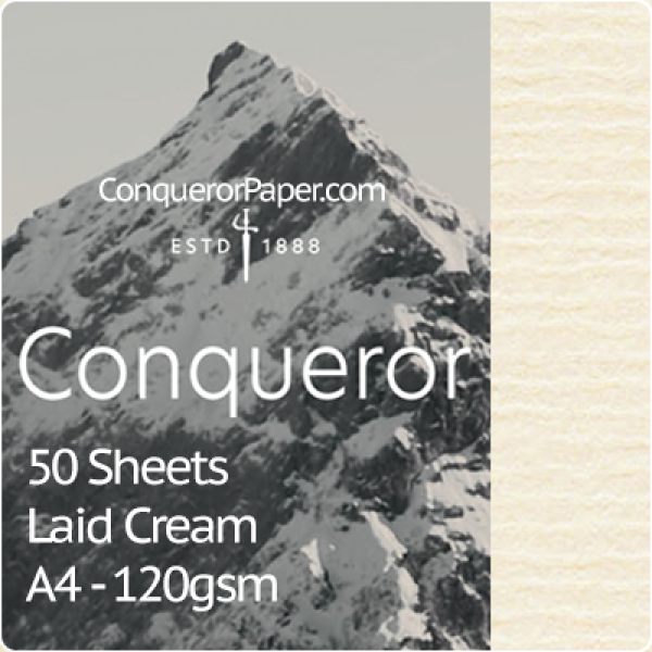 SMALL PACK Prestige Brand CONQUEROR Paper TINT: Cream FINISH: Laid (classic textured) PAPER: 120 gsm SIZE: A4 - 210x297mm QUA..
