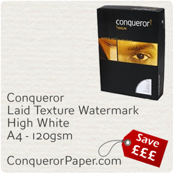 SMALL PACK Prestige Paper Brand CONQUEROR TINT: High White (off white) FINISH: Laid (classic textured) PAPER: 120 gsm SIZE: A4..