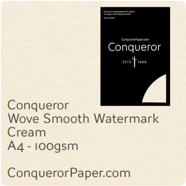 Tags: Conqueror Wove, TINT:Cream, FINISH:Wove, PAPER:100gsm, SIZE:A4 210x297mm, QUANTITY: 500Sheets, WATERMARK:Yes